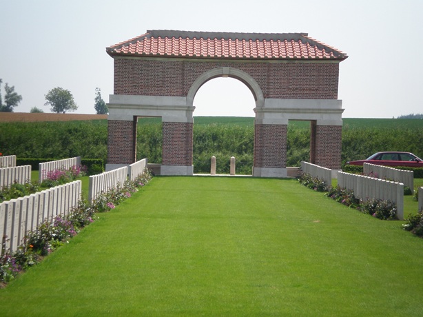 Grevillers British Cemetery has a very imposing brick and stone entrance and surrounding wall, designed by Sir Edward Lutyens, some 3 kilometres from Bapaume in the Pas de Calais. The village of Grevillers was occupied by Commonwealth troops on 14th March 1917. An Australian casualty clearing station was posted nearby in April and May and started to use the cemetery for the next 12 months. At this point it was recaptured by the Germans during their great advance. In August 1918, the Australians were back, and the cemetery began to expand. Of 2,106 Commonwealth servicemen buried here, only189 are not identified. Leonard’s last resting place, as with all other Commonwealth War Graves, is kept to an immaculate standard and this site rewards the visitor within its serenity. |