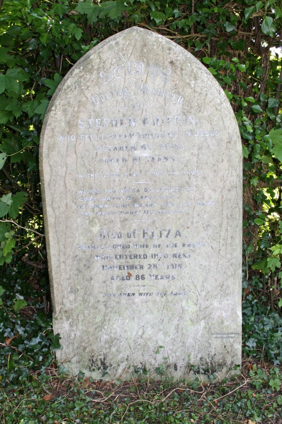 IN LOVING MEMORY OF STEPHEN GRIFFIN WHO FELL ASLEEP TRUSTING IN JESUS OCTOBER 4TH 1906 AGED 81 YEARS IN THE LORD HAVE I PUT MY TRUST