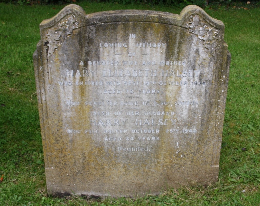 ALSO OF HER HUSBAND HARRY HALSEY WHO FELL ASLEEP OCTOBER 25TH 1940 AGED 84 YEARS