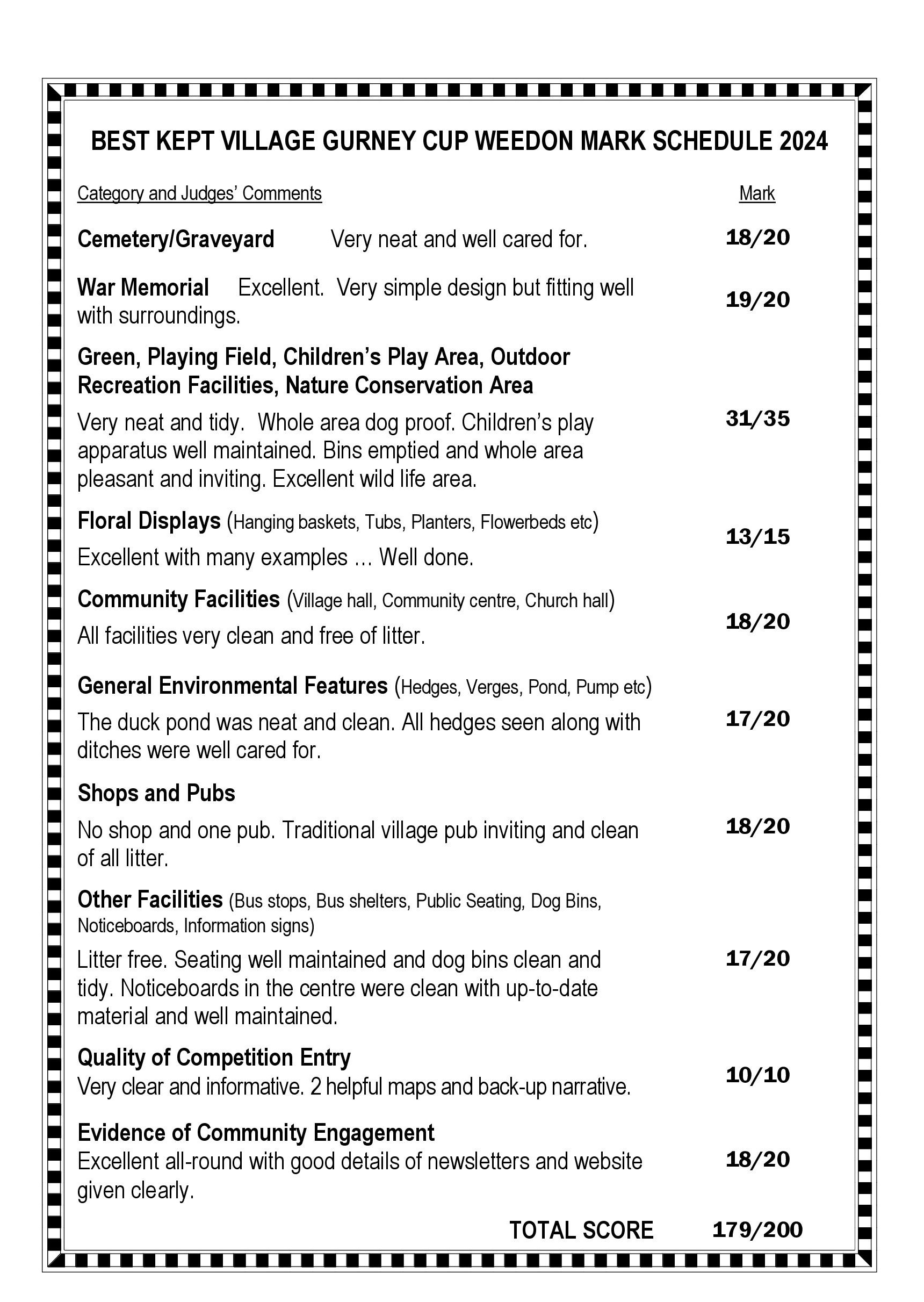 The Gurney Cup was presented by the Chairman of the Bucks Best Kept Village, Bill Chapple, on Saturday 21st September 2024. Here are the detailed results of the judges' scoring.