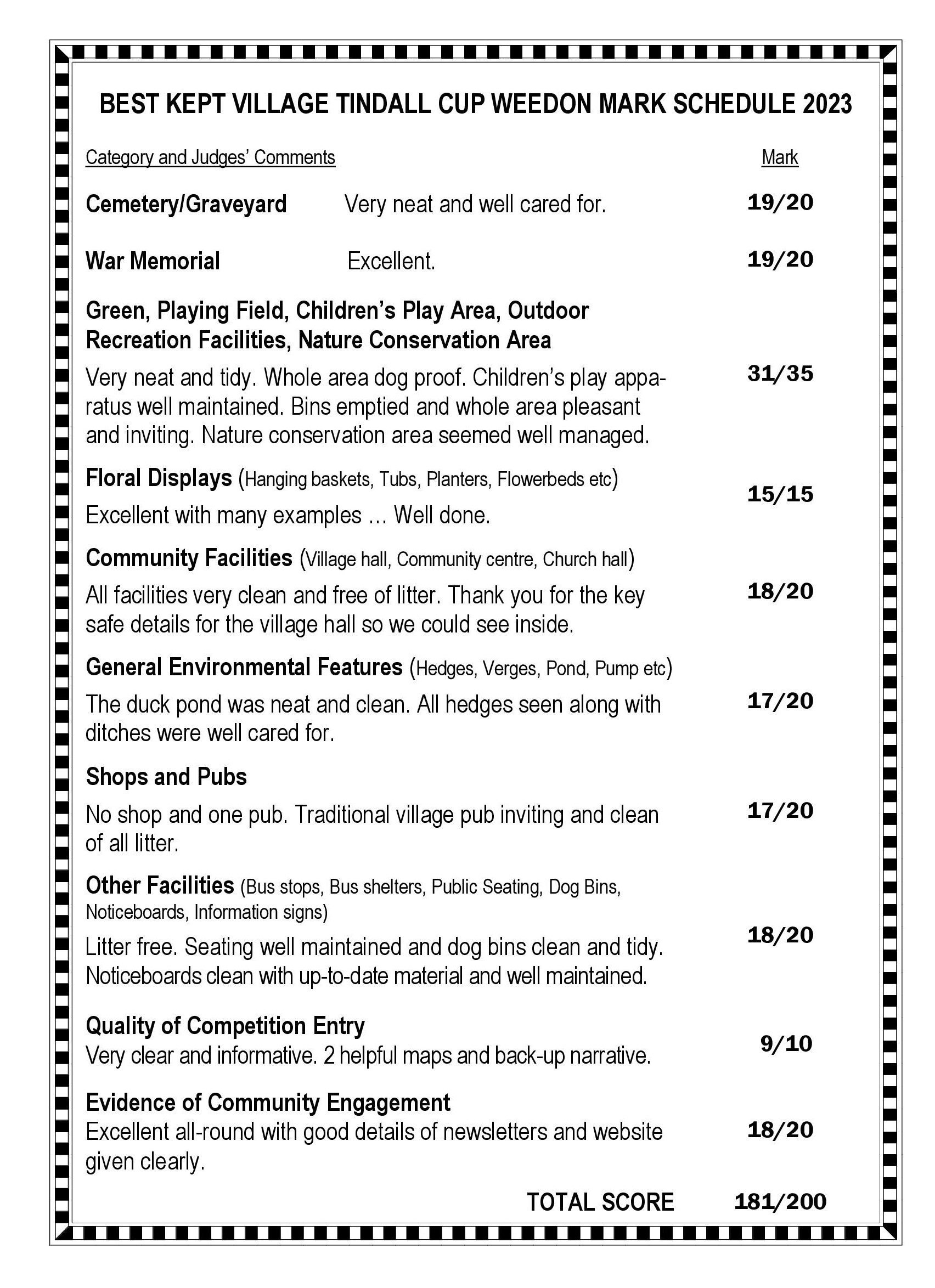 Weedon’s score was 89% - our best-ever score in the competition. As in 2016, we got 14 marks out of 15 for overall appearance and evidence of community effort. The judges were extremely complimentary in their remarks, as you can see in the detailed table here.
