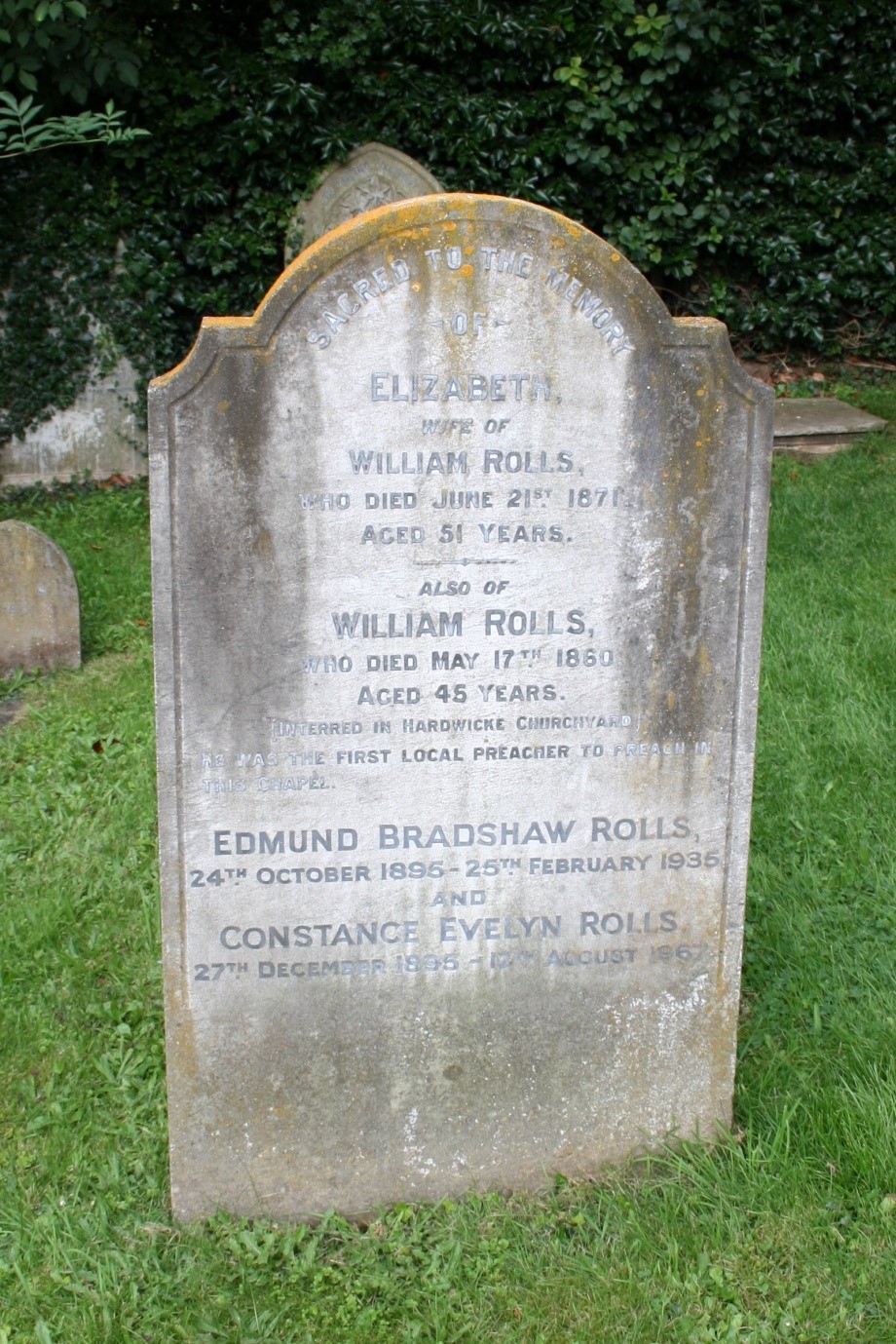 ALSO OF WILLIAM ROLLS WHO DIED MAY 17TH 1860 AGED 45 YEARS (INTERRED IN HARDWICKE CHURCHYARD) HE WAS THE FIRST LOCAL PREACHER TO PREACH IN THIS CHAPEL