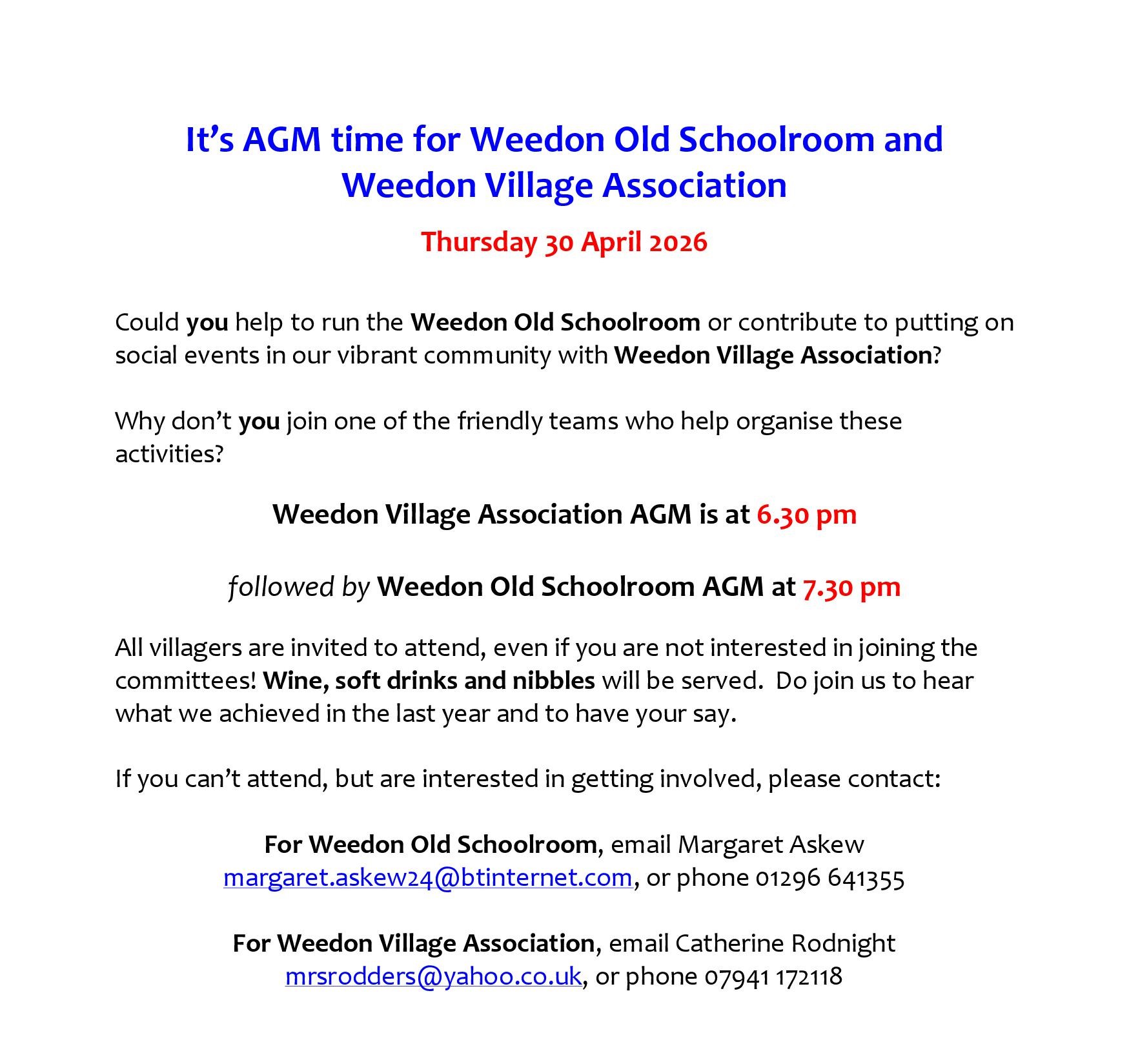 Thursday 30 April Annual General Meeting of Weedon Village Association
